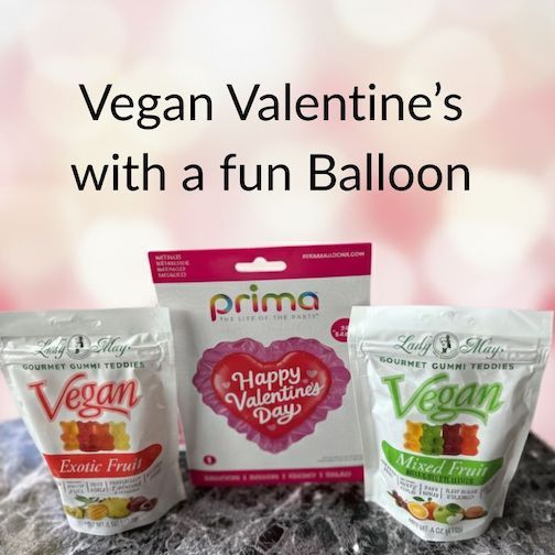 Send your favorite Vegan Fruit Gummies that are exotic and fun! Plus a special Valentine's Balloon!
