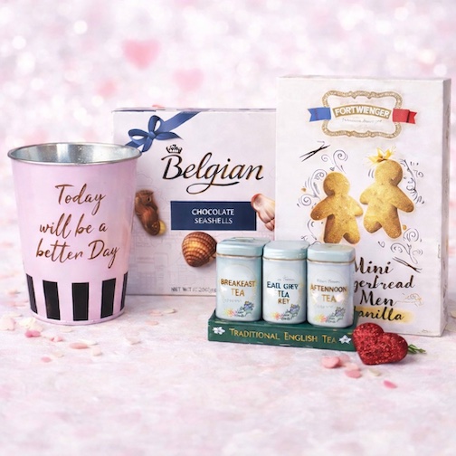 The small Better Day bucket can be used for pens. Plus Belgium Chocolate Shells, Vanilla Gingerbread Men and specialty Traditional English Tea are all boxed up and sent to your favorite Valentine!